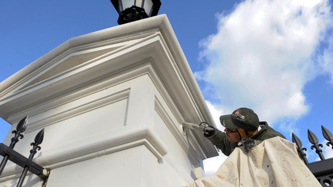 Jan. 18, 2013: A painter touches up an entrance post outside the White House in Washington in preparation for the inauguration.AP