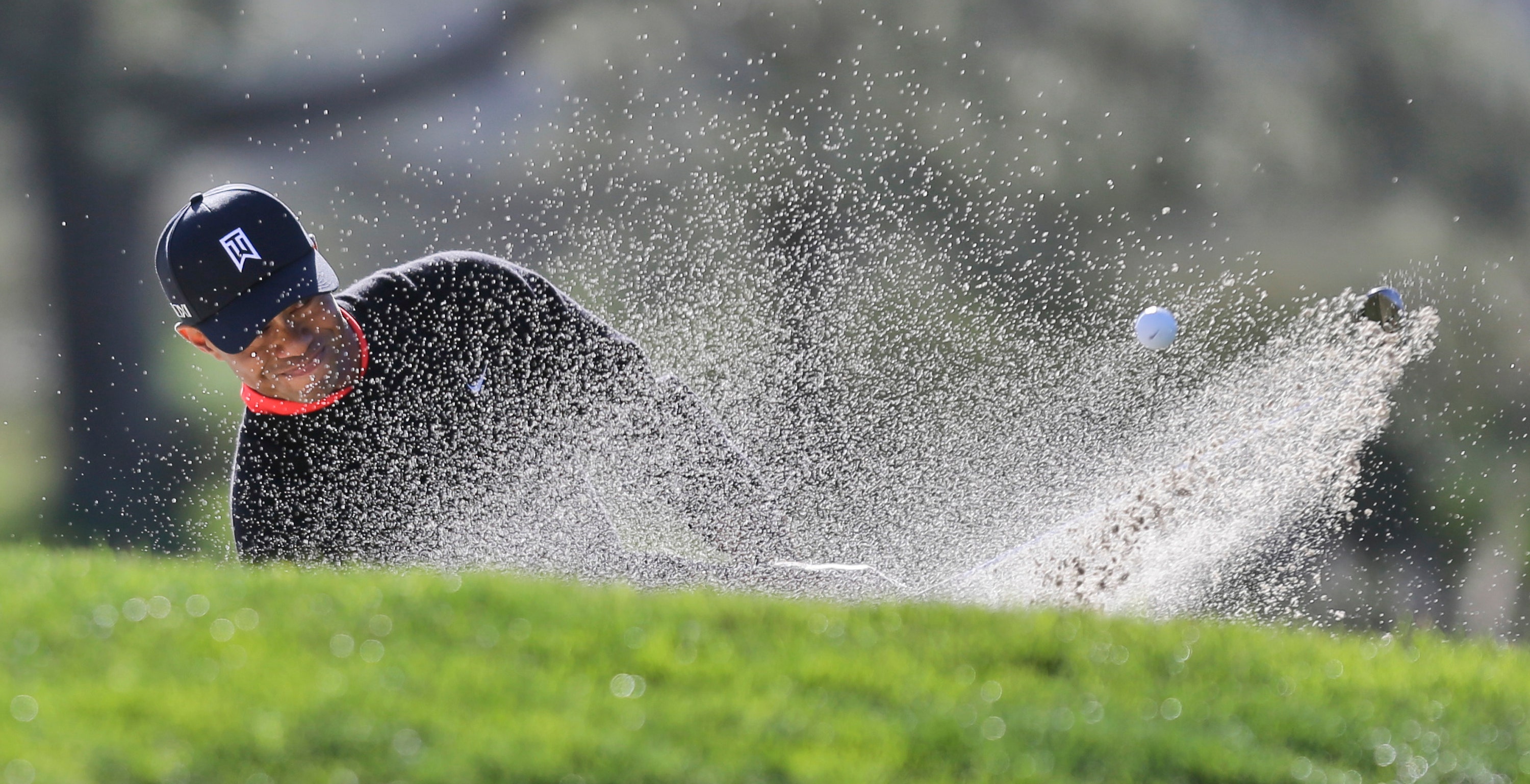 Tiger Woods blast from the bunker on the 17th hole where he made bogey but still managed to win the Farmers Insurance Open golf tournament by four shots Monday Jan. 28, 2013 in San Diego. It is Tiger's seventh victory in the event. (AP Photo/Lenny Ignelzi)AP2013