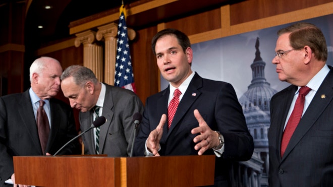 Jan. 28, 2013: Sen. Marco Rubio, R-Fla., center, speaks at a Capitol Hill news conference with a bipartisan group of leading senators to announce their agreement on the principles of sweeping legislation to rewrite the nation's immigration laws.AP