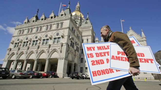 April 3, 2013: Jody Winslow, of Farmington, Conn., carries signs regarding the second amendment of the U.S. Constitution as he heads back to the Capitol in Hartford, Conn.AP