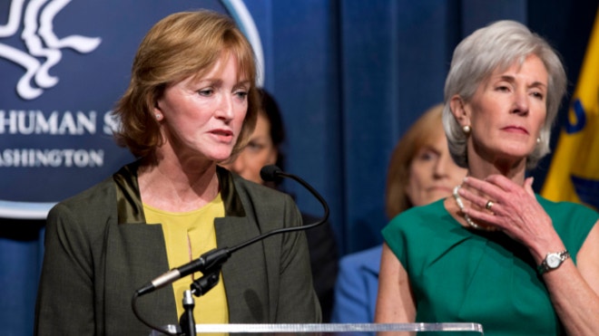 April 10, 2013: Centers for Medicare and Medicaid Services Acting Administrator Marilyn Tavenner, left, accompanied by Health and Human Services Secretary Kathleen Sebelius, speaks during a news conference at the Health and Humans Services (HHS) Department in Washington.AP