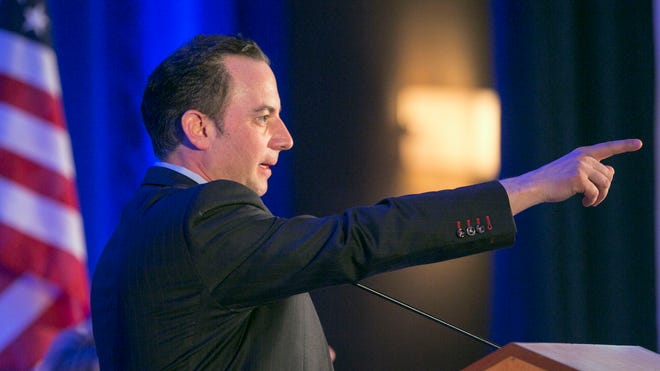 FILE: Friday, April 12, 2013: Reince Priebus, chairman of the Republican National Committee, addresses the Spring Republican National Committee Meeting in Los Angeles, Calif.AP
