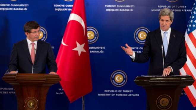 April 21, 2013: U.S. Secretary of State John Kerry, right, speaks during a news conference with Turkish Foreign Minister Ahmet Davutoglu, left, and Syrian opposition leader Moaz al-Khatib, not pictured, after a "Friends of Syria" group meeting at the Adile Sultan Palace in Istanbul, Turkey.AP