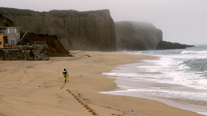 March 14, 2013: Surfer Joao Demacedo heads to a surfing spot at Martin's Beach, a popular surfing and fishing spot, in Half Moon Bay, California.REUTERS